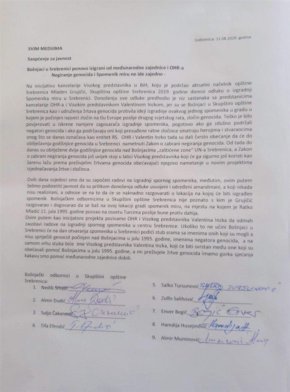 "Na inicijativu ureda visokog predstavnika u BiH, koju je podržao aktuelni načelnik Grujičić, Skupština opštine Srebrenica 2019. godine donijela je odluku o izgradnji Spomenika miru u Srebrenici. Donošenju ove odluke predhodio je niz sastanaka sa predstavnicima kancelarije OHR-a i Inzkom, jer su se Bošnjaci u Skupštini opštine Srebrenica kao i udruženja žrtava genocida protivila ideji izgradnje ovakvog jednog spomenika u gradu u kojem je počinjen najveći zločin na tlu Evrope poslije drugog svjetskog rata, zločin genocida. Teško je bilo povjerovati u iskrene namjere zagovarača izgradnje spomenika, pogotovo ako ga zdušno podržavaju negatori genocida i ako ga podržavaju oni koji presuđene ratne zločince smatraju herojima i stvaraocima onog što se danas označava kao entitet RS", navode u saopćenju.
