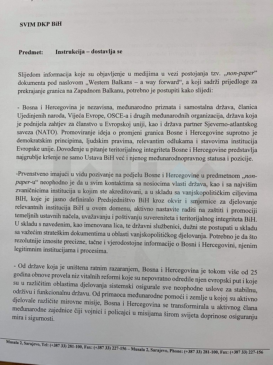 Ministrica u instrukciji, koja je u posjedu našeg portala, na početku naglašava da slijedom informacija koje su objavljenje u medijima u vezi s postojanjem tzv. "non paper" dokumenta pod naslovom "Western Balkans - a way forwar", a koji sadrži prijedloge za prekrajanje granica na Zapadnom Balkanu, potrebno je postupiti kako slijedi: