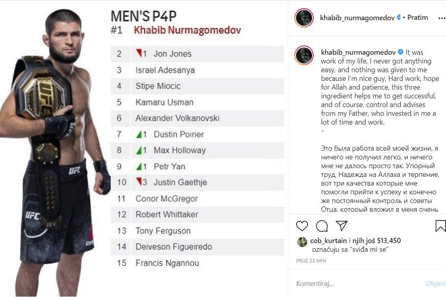 Habib se popeo sa drugog na prvo mjesto i skinuo dugogodišnjeg vladara Jona Jonesa, najboljeg borca u historiji u poluteškoj kategoriji.