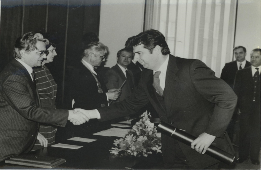 Akademik Miloš Macura i dr. Šefik Mulabegović nakon uspješne odbrane doktorske disertacije (Sarajevo, 1982)