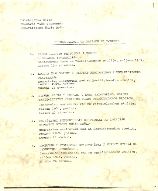 Šefik Mulabegović je u vrijeme osnivanja Više ekonomsko-komercijalne škole obavljao funkciju načelnika sektora za privredni razvoj i člana Savjeta za obrazovanje Narodnog odbora Brčko (tadašnja Vlada Brčkog). Savjet za obrazovanje u oktobru 1960. godine razmatra prijedlog za osnivanje Više ekonomsko-komercoijalne škole u Brčkom. U analizi se naglašava nepovoljna kvalifikaciona struktura zaposlenih u privredi Brčanske regije što je samo primjer općeg stanja u tadašnjoj Jugoslaviji. S tim u vezi, Savezna skupština je u junu 1960. godine usvojila Rezoluciju kojom se insistira na novim oblicima školovanja kroz savremeniju organizaciju stručnih škola i stimuliranje daljnjeg stručnog obrazovanja. Brčanska Viša škola osniva se na tragu preporuka iz Rezolucije, kadrovskih potreba za snažniji razvoj privrede te pozitivnih iskustava Više ekonomsko-komercijalne škole u Subotici.